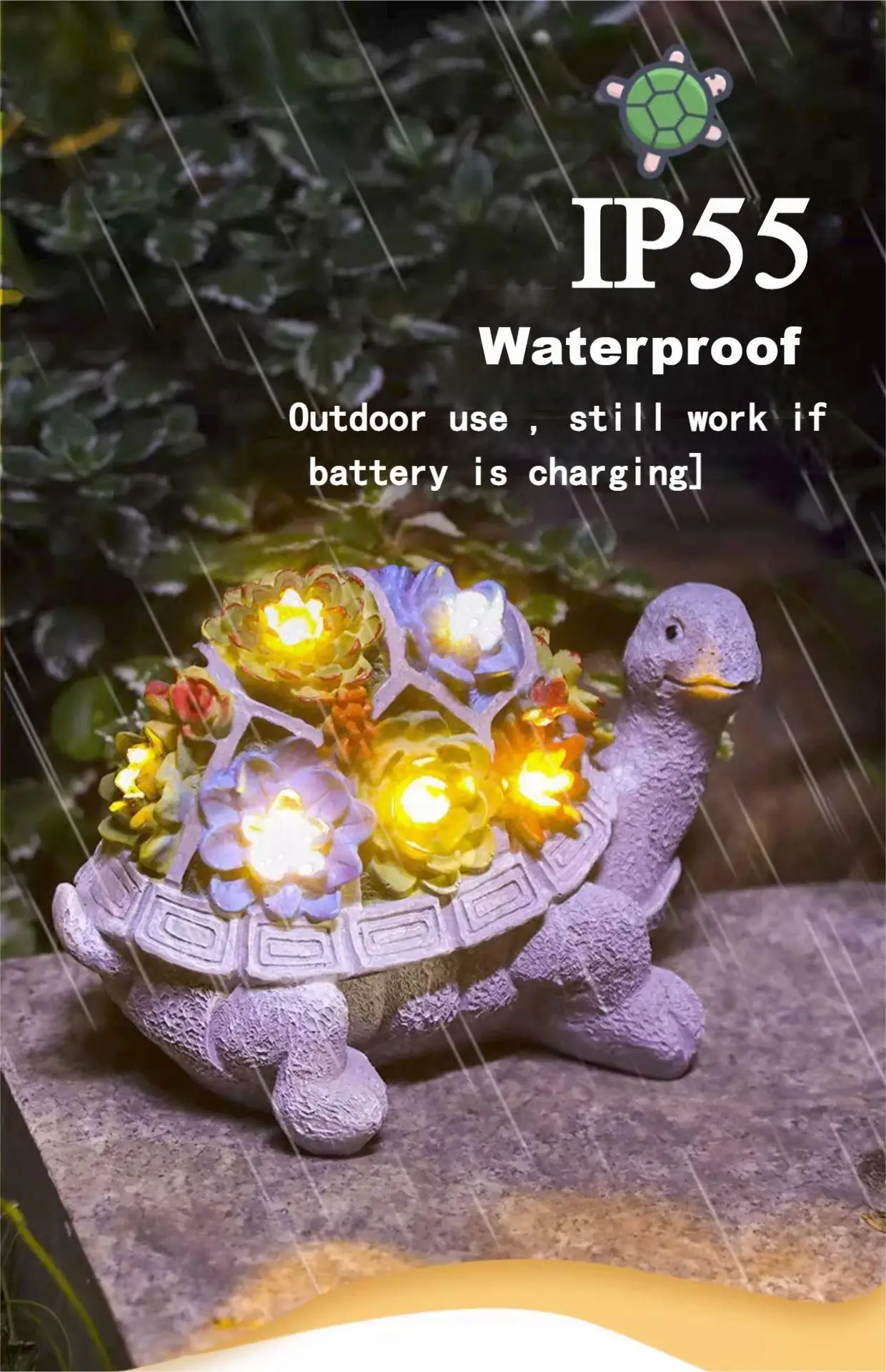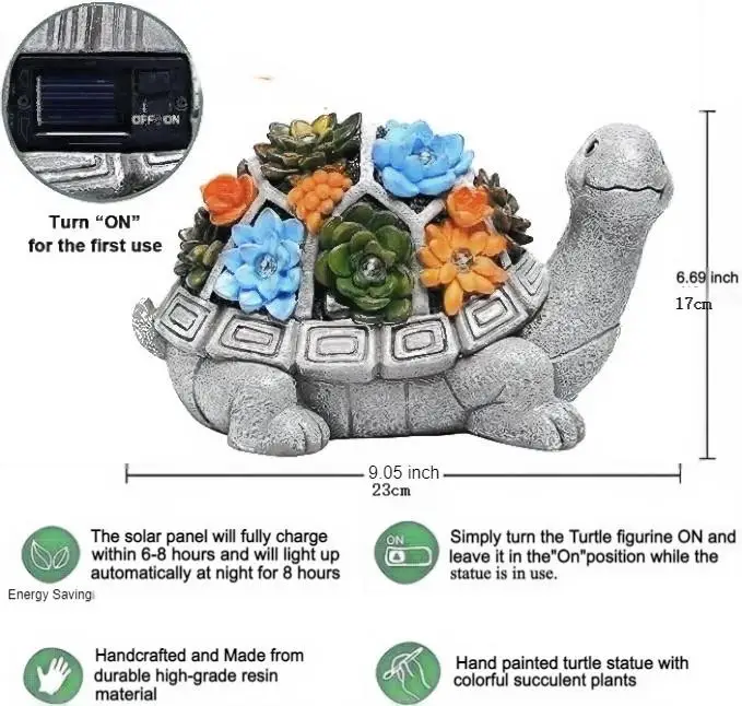- Easy to Use - Simply turn the Turtle figurine on and leave it in the “on” position during the daytime. The solar panel will charge during the daylight hours and light up automatically at night. The LED lights will fully charge within 6-8 hours and will light up for 8-10 hours